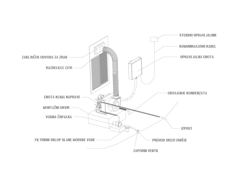 Za namestitev naprave je potrebno kupiti še napajalni kabel, vstopno / izstopno cev za vodo, cev za odvod kondenzata, cev za odvod toplega zraka, nastavek za cev za odvod toplega zraka, sesalno cev, vodno črpalko in filtre. |
