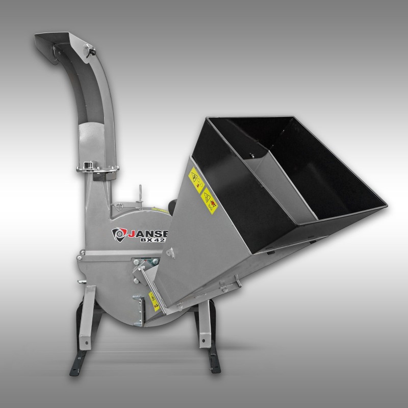 Drobilec vejevja Jansen BX-42S se ponaša z izjemno zmogljivostjo in robustno konstrukcijo, kar ga dela idealnega za vse vrste vrtnarskih del. Minimalna moč traktorja za pogon tega drobila je le 30KM, kar pomeni, da ga lahko uporabljate tudi z manjšimi traktorji. Vgrajen varnostni zatič zagotavlja, da se ob preobremenitvi ali blokadi zatič poči, kar omogoča brezskrbno delo tudi z močnejšimi traktorji nad 100KM. Drobilec je zasnovan tako, da preprečuje zabijanje in mašenje materiala, kar povečuje njegovo učinkovitost. Koritasta odprtina za drobljenje je dimenzij 51x51 cm, kar omogoča enostavno podajanje vejevja in grmičevja. Z zmogljivimi obojestranskimi noži, ki jih lahko ob obrabi obrnete, in nasprotnim nožem, je drobilec sposoben hitro in učinkovito obdelati tudi večje količine materiala.